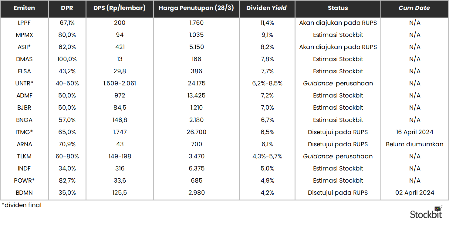 Memasuki akhir bulan Maret 2024, mayoritas emiten telah mengumumkan kinerja untuk tahun buku 2023. Beberapa perusahaan pun telah mengumumkan rencana pembayaran dividen untuk dibagikan dari tahun buku 2023. Tim Stockbit merangkum beberapa perusahaan yang menawarkan dividen yang menarik (di atas 4%), baik berdasarkan pengumuman emiten, guidanceperusahaan, maupun estimasi kami. |