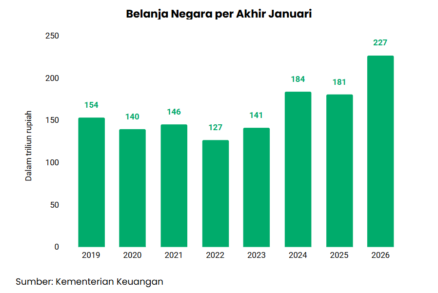 Kementerian Keuangan menyebut bahwa akselerasi belanja pada Januari 2026 ditujukan untuk mendukung program prioritas, menjaga daya beli, dan mendorong pertumbuhan ekonomi selama 1Q26. Peningkatan terutama pada belanja kementerian/lembaga, didorong oleh realisasi pelaksanaan program Makan Bergizi Gratis yang mencapai Rp19,5 T (vs. Januari 2025: Rp45,2 M).