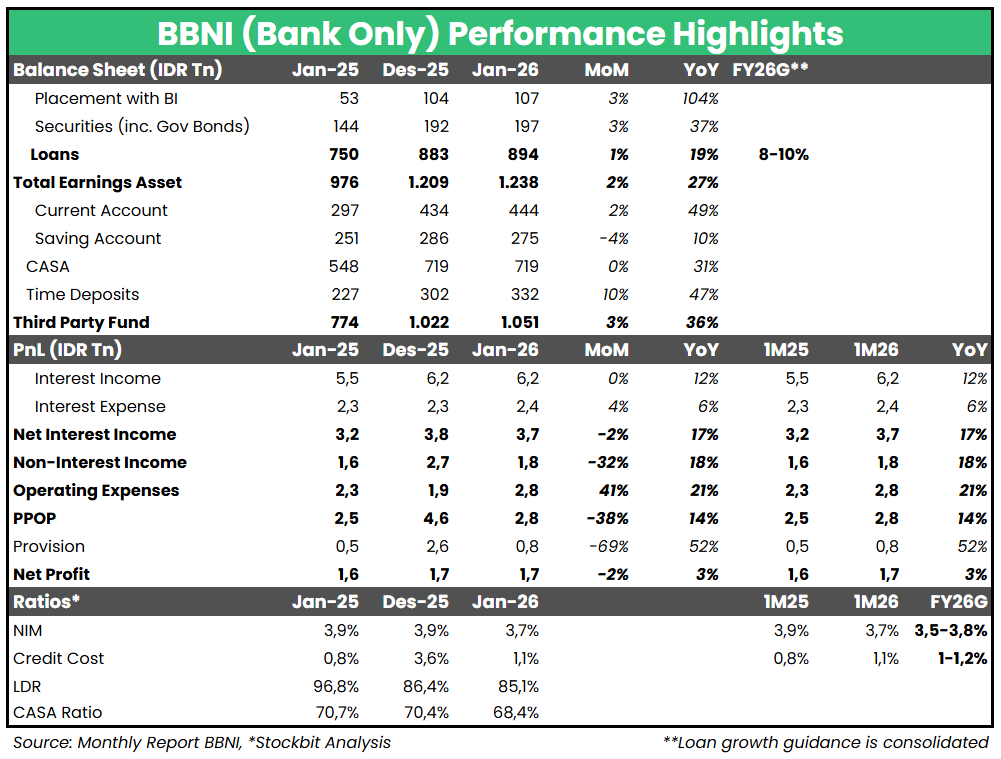 BBNI mencatatkan laba bersih bank only sebesar Rp1,7 T (+3% YoY, -2% MoM), setara 7,7% estimasi konsolidasi 2026F konsensus (vs. 1M25: 8,1% realisasi konsolidasi 2025). Kenaikan laba bersih bank only terbebani oleh biaya provisi yang naik +52% YoY di tengah Pre–Provision Operating Profit (PPOP) yang tumbuh +14% YoY menjadi Rp2,8 T. Pertumbuhan PPOP sendiri didorong baik oleh kenaikan Non–Interest Income (+18% YoY) dan Net Interest Income (+17% YoY) seiring dengan pertumbuhan kredit yang mencapai +19% YoY per Januari 2026. NIM tercatat lebih rendah di level 3,7% (vs. Januari 2025: 3,9%), sejalan dengan guidance 2026F manajemen.