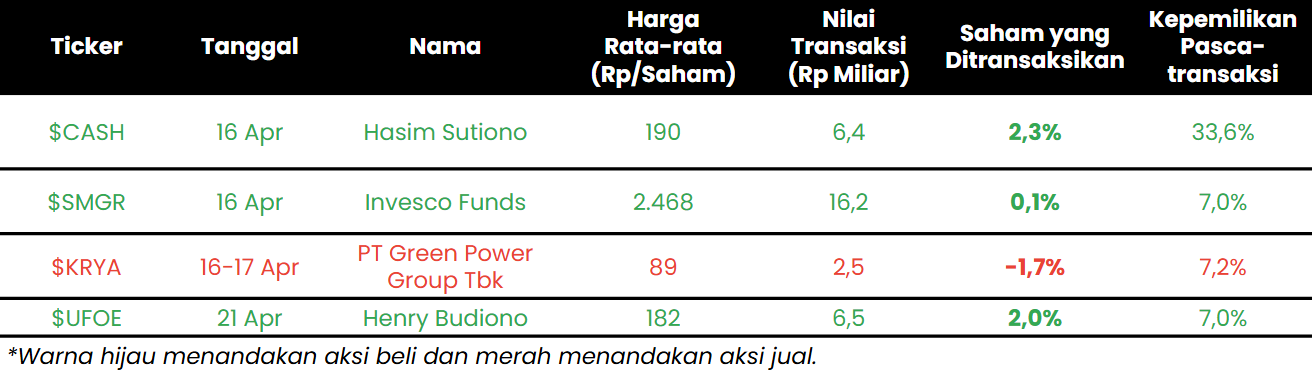 - Central Omega Resources ($DKFT) mengumumkan telah mengalihkan ~124,8 juta saham treasuri (setara ~2,2% saham) dengan harga Rp780/saham pada 17 April 2026. Total nilai transaksi mencapai ~Rp97,3 M di pasar nego, dengan pembeli merupakan non–afiliasi. Setelah transaksi ini, DKFT tidak lagi memiliki saham treasuri.